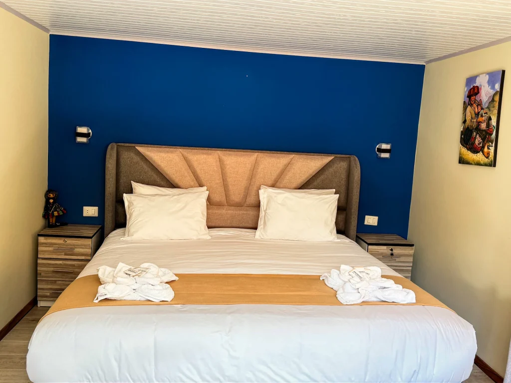 Disfrute una estancia inolvidable en nuestro hotel cerca a la estación de tren en Ollantaytambo. La habitación matrimonial, ideal para parejas o viajeros que buscan un ambiente romántico y cómodo. Rel