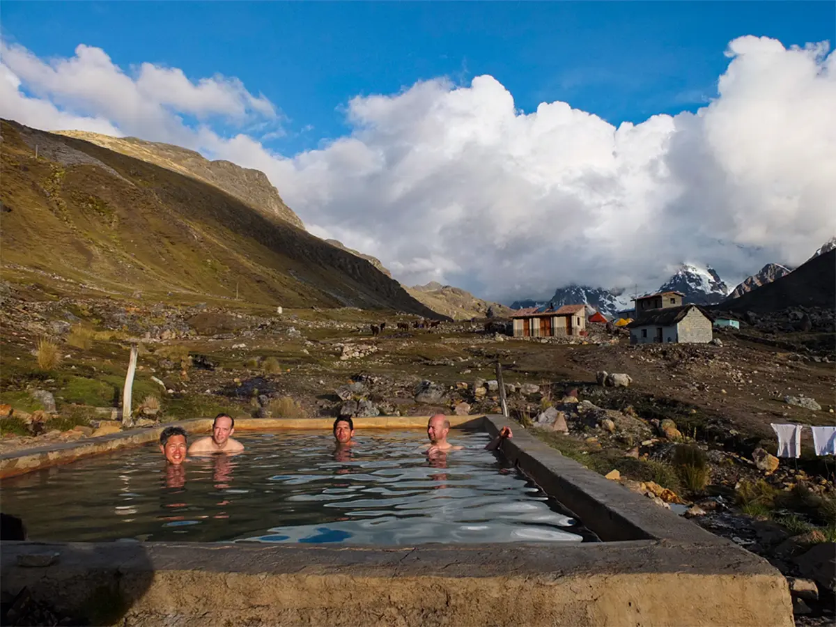 The afternoon will take us to our 2 last visits, along some of the most beautiful scenery of the whole trek. The first one will be after a descent to Qomer Lake. There we will stop to take in the beauty of this glacier fed lake. Continuing, the next stretch will take us descending for 5 hours to Pacchanta. This little community is famous for its hot springs, where we will take a plunge and relax after such a journey.